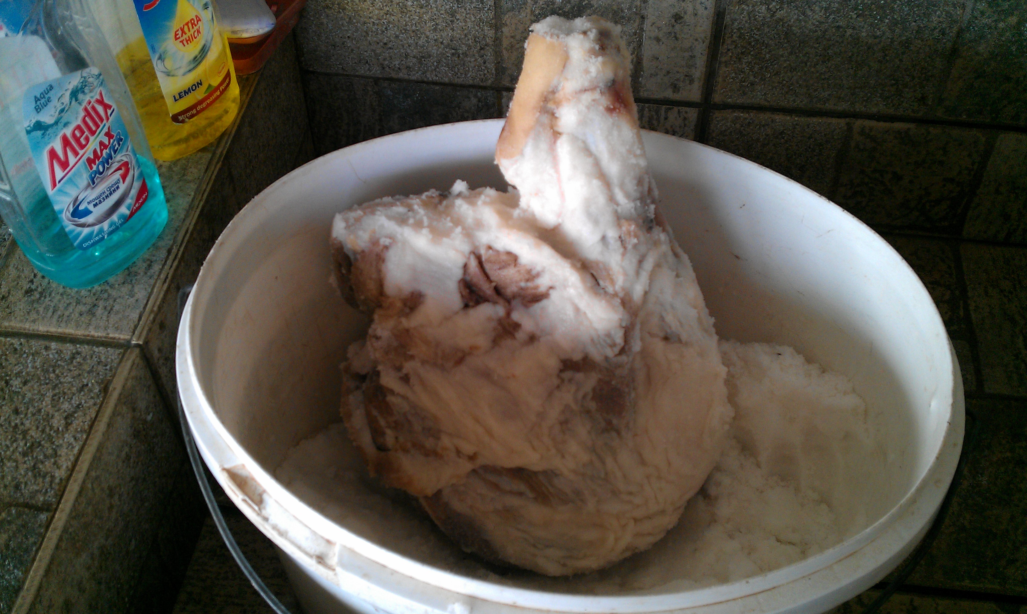 misho5kov има 2 варианта. Единият е сухо осоляване, като е хубаво кофата да има отвор отдолу защото изтича кръв и да не се задържа. Другия вариант е да кисне в така наречената саламура(Вода и сол), а някой слагат вътре и зелева чорба. След като всичко е покрито със сол няма какво да пипаш, освен ако се оголят някои места да ги досипеш със сол.