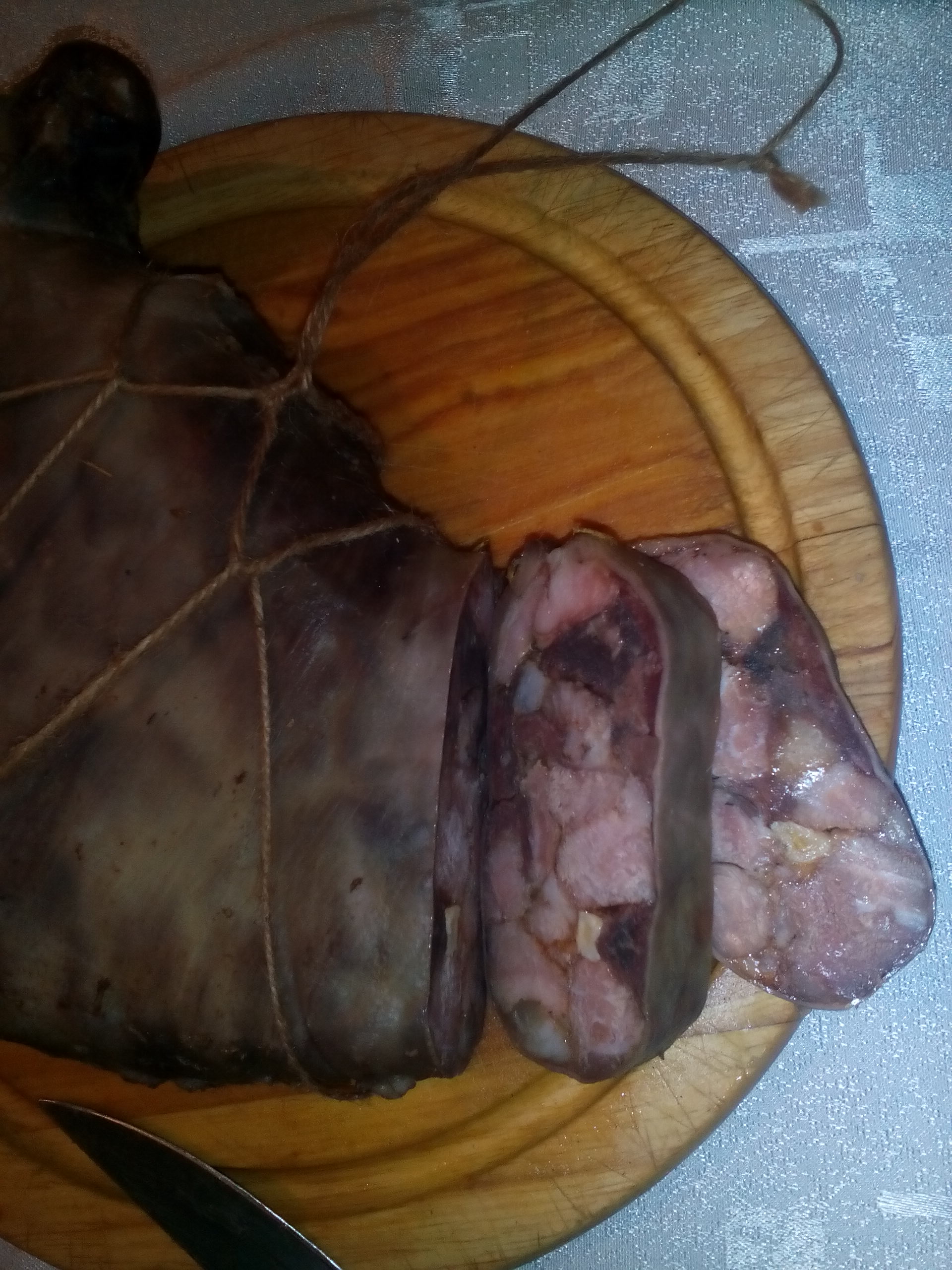 Измивам кабелни превръзки, отрязвам краищата под ъгъл, пробивам месото директно с тях, слагам малко чесън на дупките и окачвам да съхне.