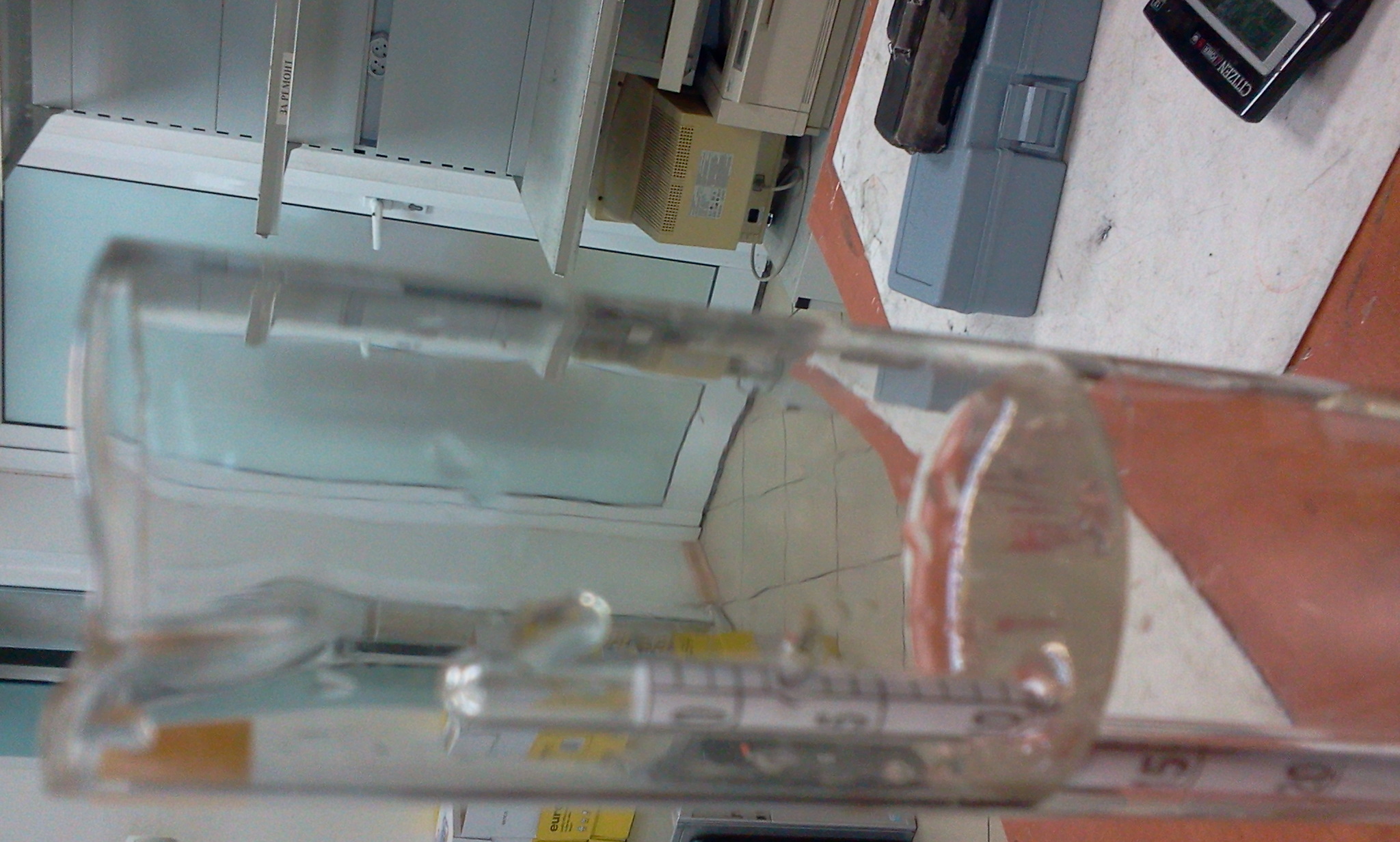 Отчитането е "горно" - гледа се горната част на омокреното от течността (викат му мениск)