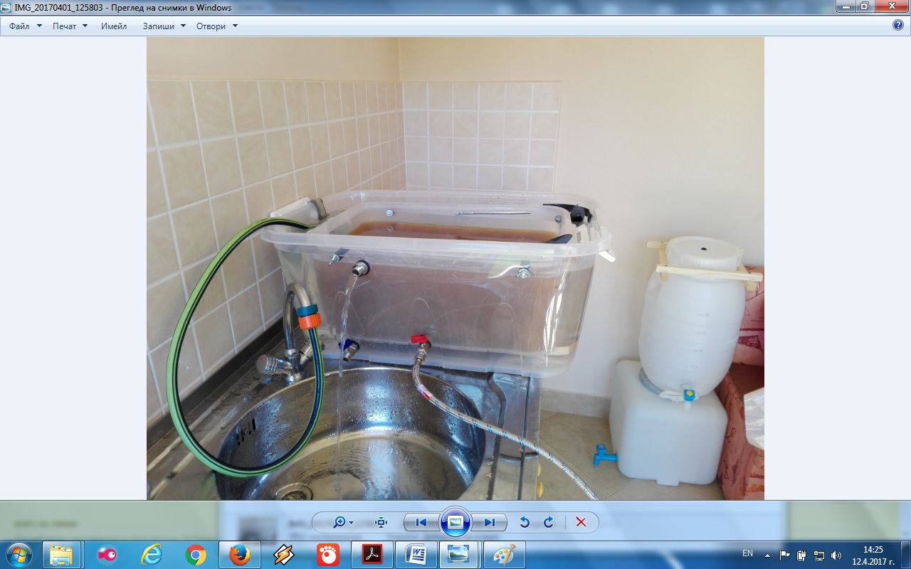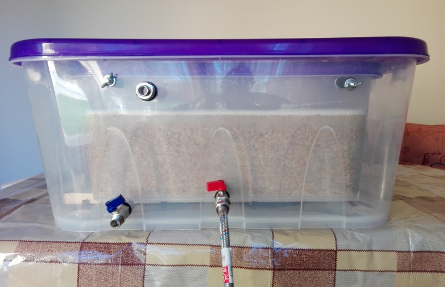 Докато събирах оборудване направих ПВЦ кутия за озахаряване, като я поставих в друга кутия за по-добра изолация с цел задържане на температурата по време на озахаряването, поставих и кран 3/8(червеният) за източване по време на промиването.Връзката между крана и тройника в по-малката кутия направих с удължител 3/8, фиксирах кутиите една за друга с 4 болта и тръба между двете кутии, под дъното на малката кутия направих дървена скара за да може да минава студена вода по време на охлаждането, на по-голямата кутия сложих и преливник ( под ръба на малката кутия за да не влиза вода в охлаждащата се мъст) и кран (синият ) за източване на студената вода след охлаждането.Кутиите са за хранителни продукти и издържат на температура до 106 градуса (така поне пише на етикета ), малката кутия е 30 литра а голямата 60.Това мое приспособление използвам както за озахаряване така и за промиване и охлаждане, по този начин отпада необходимостта от серпентина.Може да се направи и конфигурация с по-малки кутии спрямо варката.