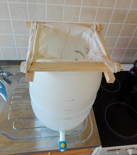 Това е друго мое приспособление-дървена рамка, която задържа торбата за финалното прецеждане.