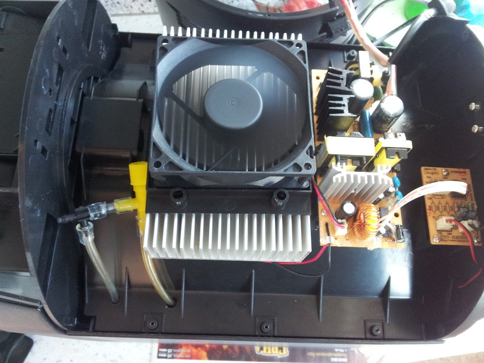 Охладителя е на базата на ТЕС(термо електичен елемент 12706 ). Премахнах старата термо паста, полирах контактните повърхности поставих нова паста и т.н...ТЕС се управлява от аналогов контролен модул с термистор, залепен на дъното на съда. Контролера е настроен фабрично да поддържа 3С на дъното, което е малко, но има възможност чрез поставянето на допълнителен потенциометър във веригата на термистора, въпросната температура да се повиши или донастрои. След достигането на темературата, светодиодната индикация на предния панел изгасва, намалят се оборотите на вентилатора(чрез PWM), но TEC продължава да е захранен с минимално напрежение, колкото да предотврати термалния преход при липса на захранване.(При активна рбота харчи ~70W, а когато е в пасивен режим 8W - измерих го :) ) това ми хареса в този уред, т.к. имам доста опит с термо-електичните елементи и това е един доста голям техен недостатък като им спреш тока :), но тук е отстранен.