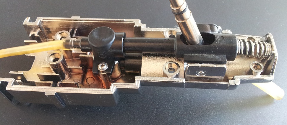 Относно СО2 -то, няма нищо сложно, просто тръбичката която е на бързата връзка за газа ( за да се стигне до нея, трябва да се махне задния пане, вентилатора, радиатора, и след това втората черна пластмаса, която се вижда на снимката "Сглобен и работещ" а ако ще бараш там си смени и пастата на термо елемента продава се в магазините за ЕЛ.Части или идва като подарък към процесорите за РС), ... правиш си една дупка където ти е удобно по пластмасариите, и си вкарваш тръбата след редуцира на СО2 бутилката към бързата връзка...Аз взех шлаух с 4мм вътрешен диаметър, но се оказа голям, според мен 3мм ще е по-добре...и след това си регулираш налягането от бутилката, а на предния панел където е врътката може да сложиш потенциометър за регулиране на температурата(там трябва да махнеш цялата "кофа" и след като е сложиш ти трябва силикон към пластмасите)...Препоръчвам ти ако правиш това, да свалиш клапана за СО2 и да го разглобиш и почистиш...разглобява се с шестограм 5мм и 2 болта. Ще кача още снимки, когато направя и това...за сега трябва да си намеря редуцир...така, че ако някой колега има излишен от Варна, приемам оферти :).
