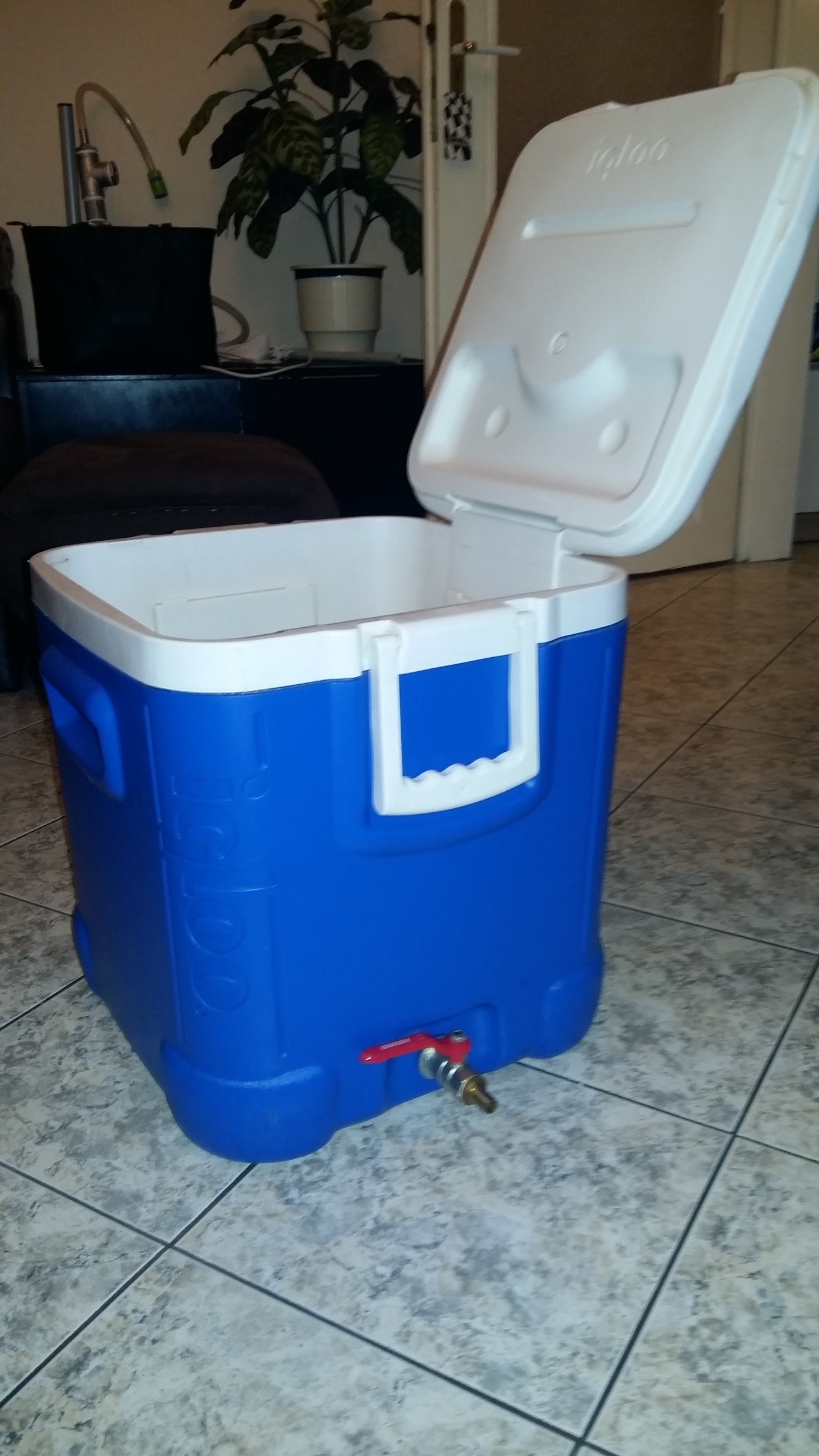 Тръбичката минава през дупката на Igloo-то, от вън е едно уплътнение, шайба, крана и щуцера. Отвътре е другото уплътнение и шайба, муфата и след това нипела. Използвах муфа и нипел, за да мога да затегна добре с муфата частта към крана, която е неподвижна, а с нипела навивам едновременно към муфата и Manifold, като там не е нужно да е плътно и стегнато за да може да се сваля и да се почиства, а и да пропуска не е проблем. Тествах системата, тече добре с чиста вода, няма течове около крана. Не съм затягал прекалено силно, за да не повредя Igloo-то. Тръбите ги рязах с зеге, както и отворите. Опитах с флекс, но се топи и стават прекалено големи отвори. Малко са неравномерно, но е трудно със зегето. Прикачих ги към тройниците и колената, като загрявах от всеки край на тръбичките и с клещи сгъвах , за да може да влезе. След това с един гумен чух ги сглобих (хич не беше лесно). Почистих остатъците(мустаците) от PVC с каквото намерих и накрая с една голяма пила. Дано съм бил полезен на някой