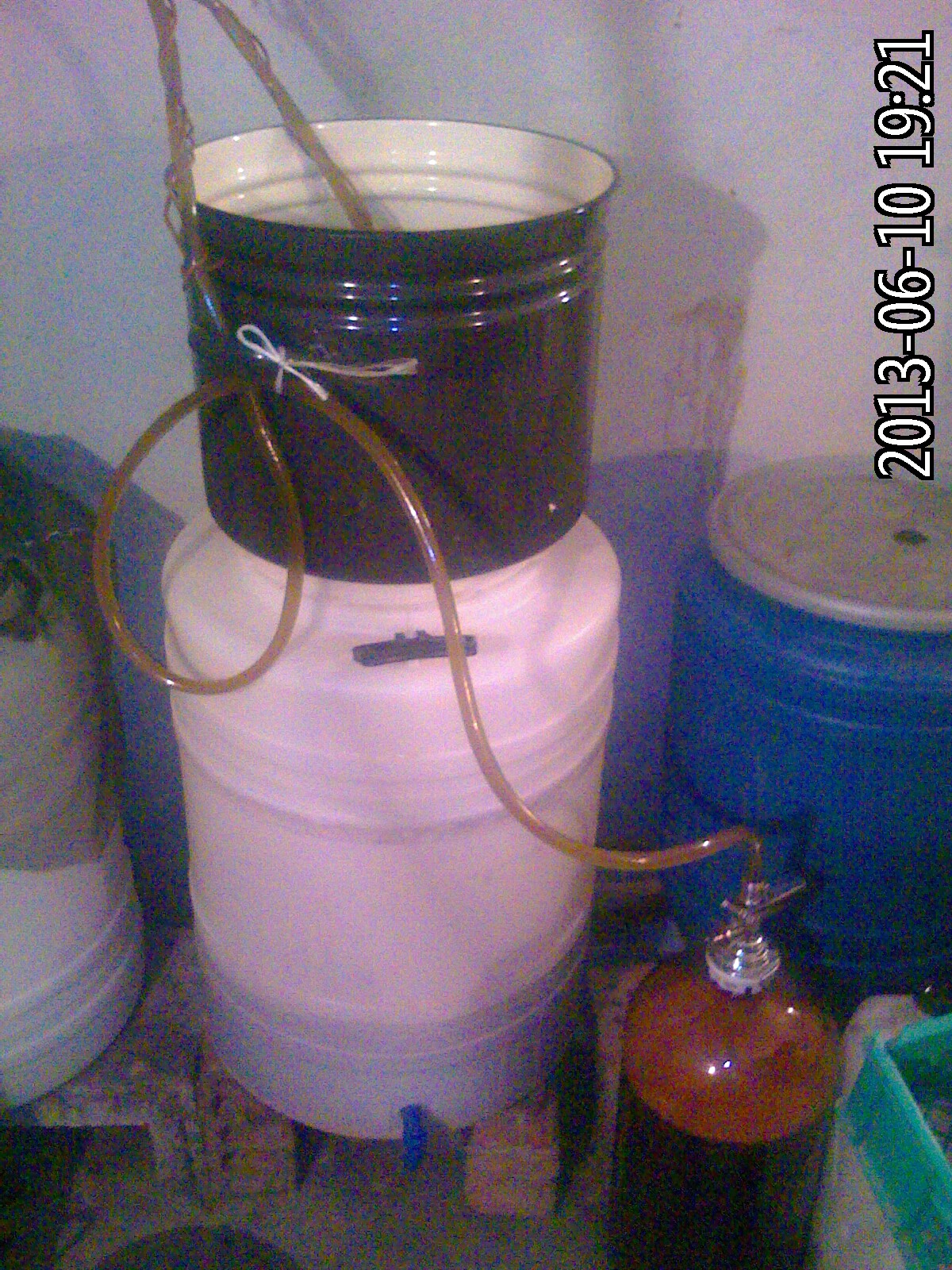 След като се напълни до малко след скоса, вадя маркуча, слагам една малка фунийка и през нея добавям 1литър бира с разтворена в нея нужната захар за карбонизацията.