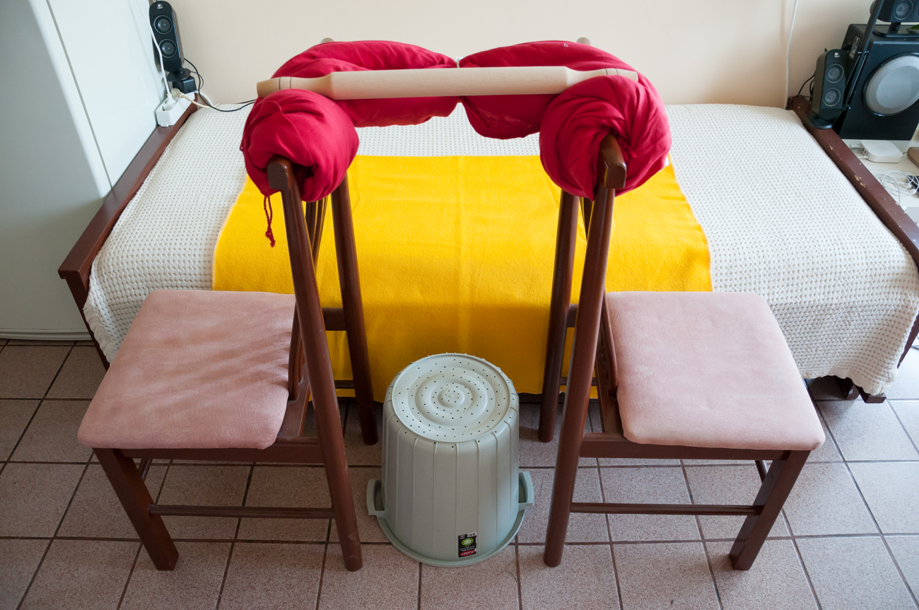 • варианта, който предпочитам, е с частично промиване и се вижда на снимките – докато торбата се отцежда, доливам вода през горния отвор; обикновено не използвам цялата вода, а изчаквам да се съберат около 10 л и слагам да завира, след което доливам до 13 л; всичко това се случва за около 30 мин;