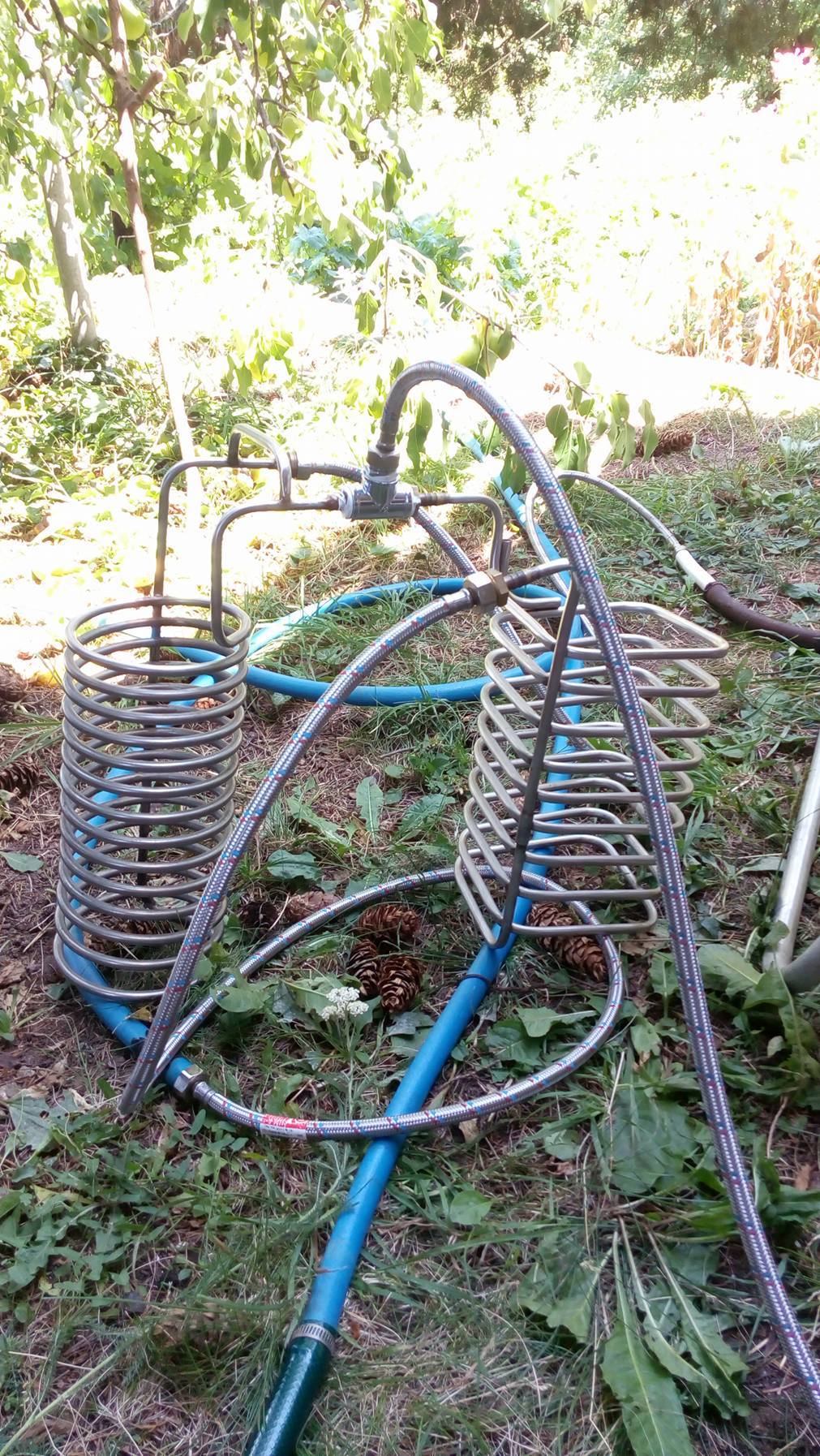 Охлаждането отне 1 час до 22-25 гр. с две серпентини, свързани заедно с тройник и вода от кладенец. Белтъците се пресякоха добре и застанаха на големи парцали. Финалното прецеждане мина спокойно и сравнително бързо. В крайна сметка във ферментатора влязоха 45-47 литра на 15 Плато. Заквасихме с дрожди US-05, 20 гр., които бяха смесени с отделена след озахаряването мъст и оставени на магнитна бъркалка да се развиват. По някое време им сложихме и малко захар, че бяха поизяли храната която имаха. ИБУ-то не сме го изчислявали, но опитахме малко мъст, като по общо мнение е поне 50. Цвета на бирата е кехлибарен амбър, аромата е много добър. Смятам, че ще се получи една добра бира. Ферментатора е поставен на постоянна температура от 20-21 гр. Началото, поставихме в 09.00 часа и в 16.15 приключихме с всичко. Толкова с писането, сега малко снимков материал :)