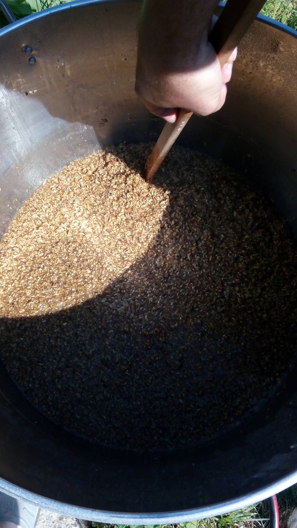 Озахаряване в казан с "фалшиво дъно", загряване с газов котлон тип "Колос". Корекция на Ph-то с добавяне на 3-4 мл. Млечна киселина. Смесване на 66-68 гр. и поддържане на тази температура за около 50-55 минути и доста бъркане (още след това излезе йодната проба), загряване до 72 гр. и задържане още 10-тина минутки, след което маш аут на 78 гр.