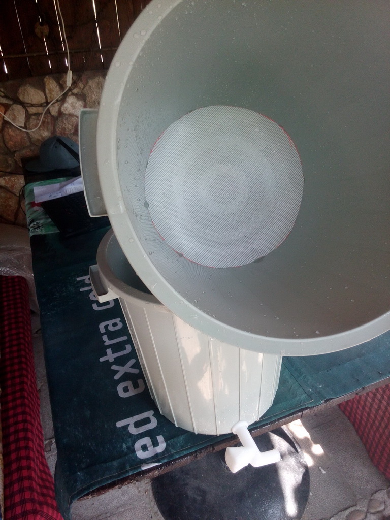 Самодельная фильтр система - ведро в ведро. в верхнем ведре дырявое дно и вложена сетка.