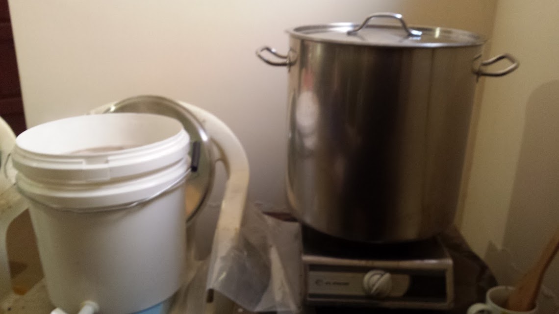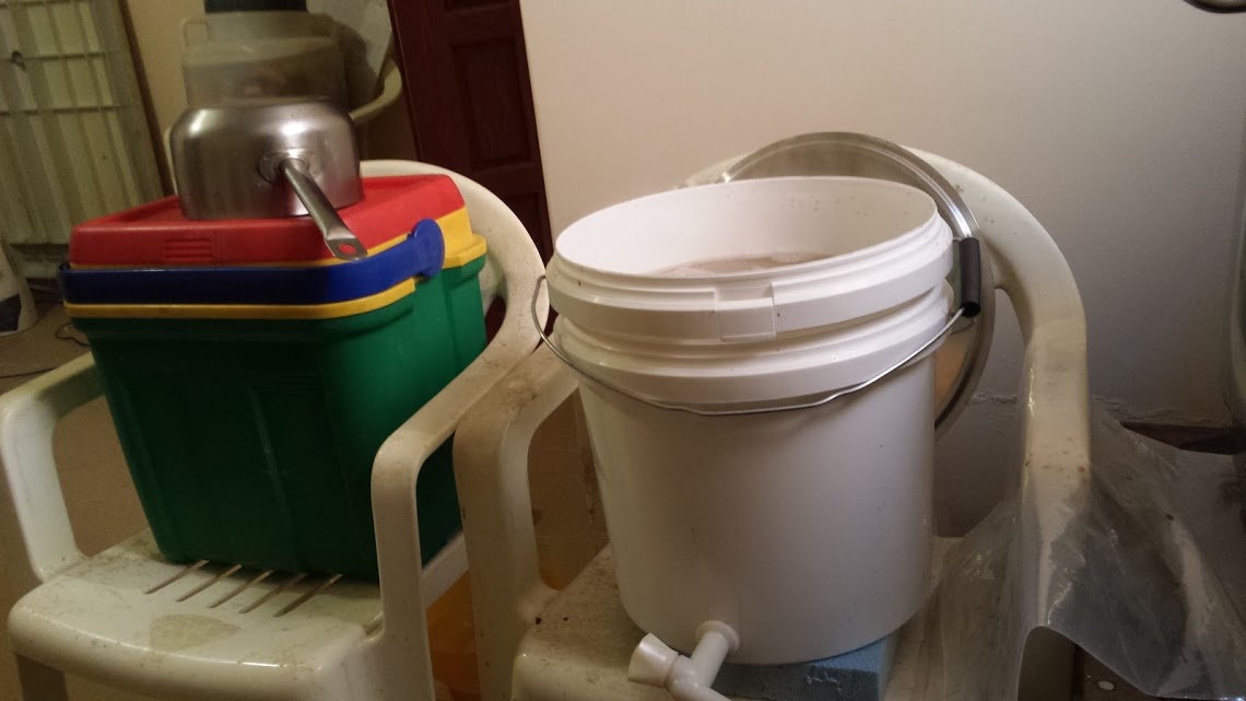 етикетите от бирените бутилки. Загрях вода в хладилната чанта с бързовара. На 12-15 л. вода добавих половин бутилка