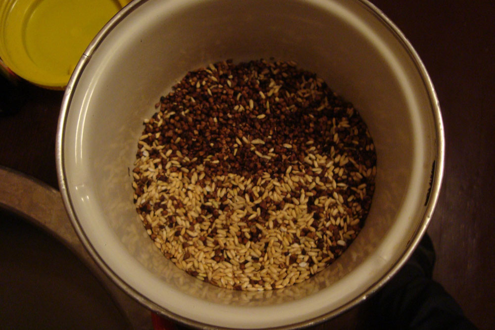 Другото което направих - елдата запържих с лук и гъби, а сладкия сироп, който остана (1л, 5%В) разредих с вода, добавих захар (бляла, мусковадо не намерих) до 14%В. Запекох малко ориз и елда варих ги 15 мин и водата добавих към общото (това уж за цвят и милко аромат)