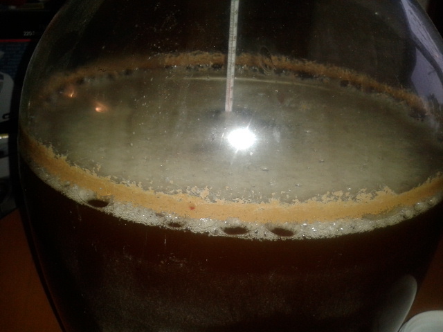 Бирата беше заквасена в събота 14:00 часа, докато дрождите се задействат стана неделя вечерта а днес сутринта вече са в пика си ,тоест най-мощната ферментация е на 72 часа от вкарването на дрождите който бяха в стартер(дрожди ДИАМАНТ) захарноста е паднала от 13.3 днес беше около 11.5 брикс .Цвета е амбър и леко клони към кафяво ама много леко.Ще видим какво ще излезе накрая.Наздраве