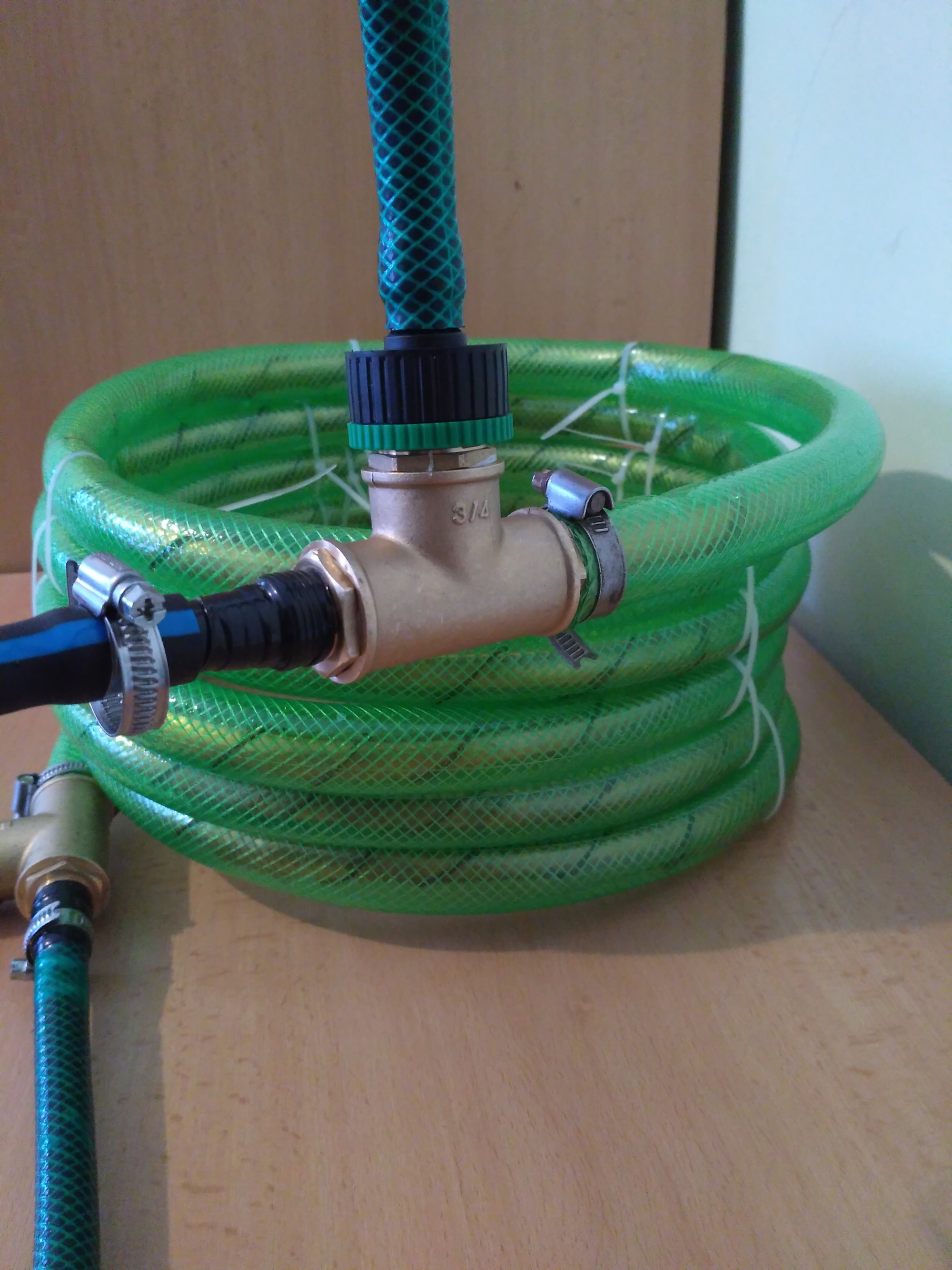 - пробвах да сложа връзка за медна тръба и на нея с нипел и редукция да сложа бърза връзка, но тва цялото протече. Махнах го и стегнах маркуча със скоба - префектно е!