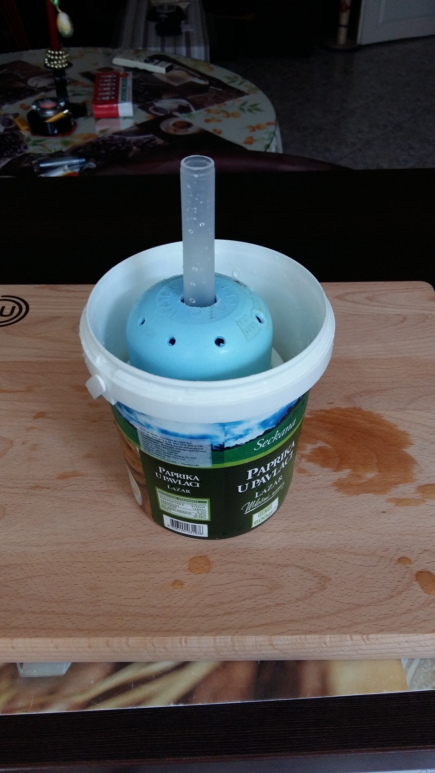 Отворът на синьото капаче трябва да е по широк от диаметъра на тръбичката за да не запъва при помпене, пробиват се и няколко отвора по нея за да не затруднява помпенето.