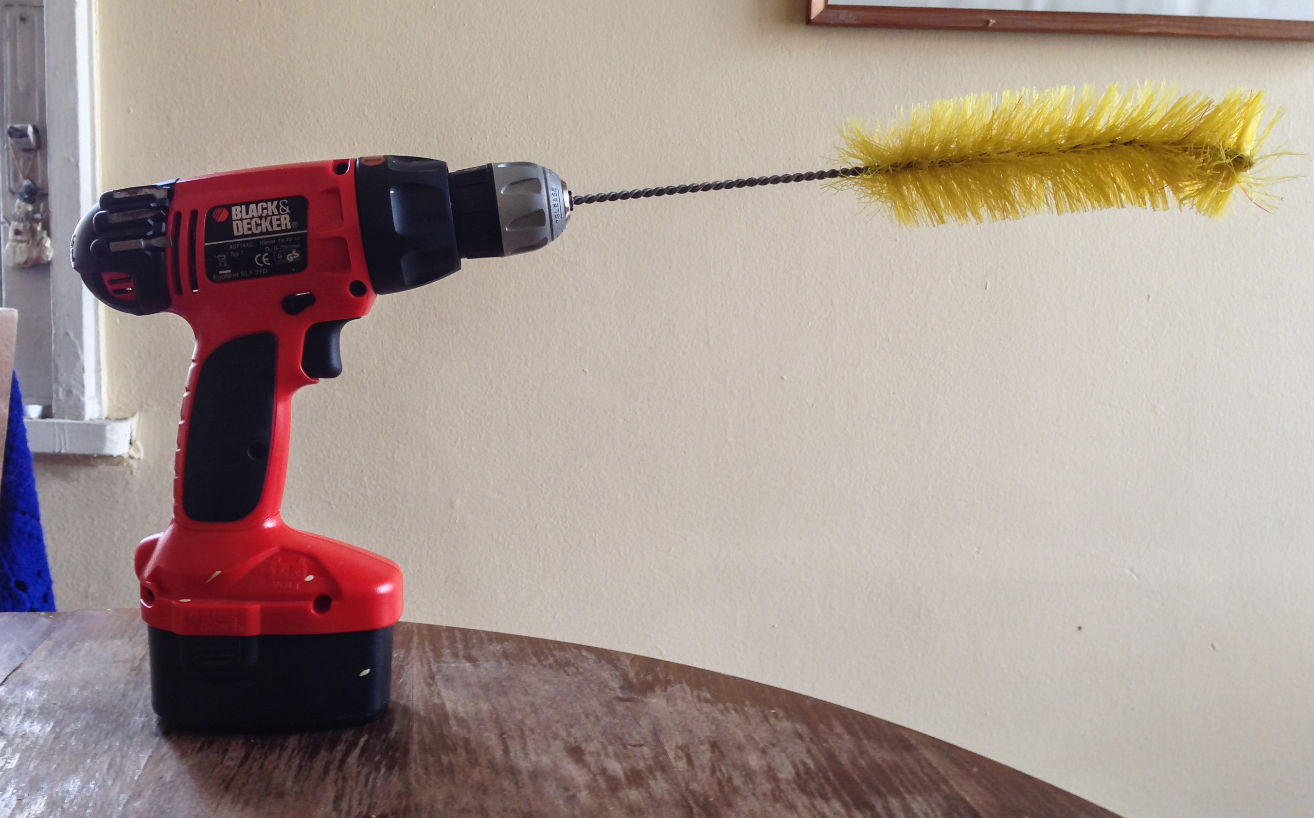 Бях забравил едни бутилки неизплакнати и по дъната се бяха натрупали плесени. Пробвах да ги чистя с четка за бутилки, но се оказа много тегаво. Отрязах дръжката на четката и я сложих на винтоверта. чистенето стана много по-бързо, лесно и качествено :D .