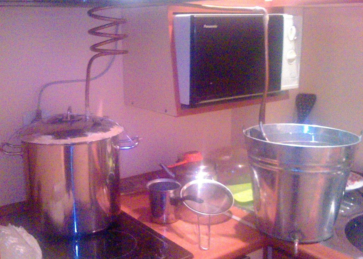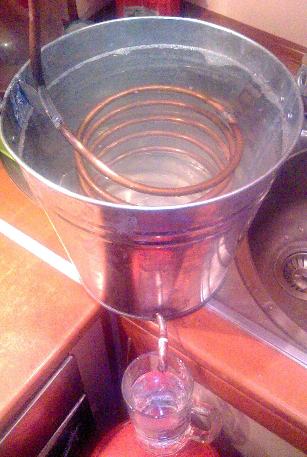Капакът се наложи да се пробива, една муфа запоих (фи 10мм), следва тръба медна фи 10, една кривка, серпентина и кофа за охлахдане :