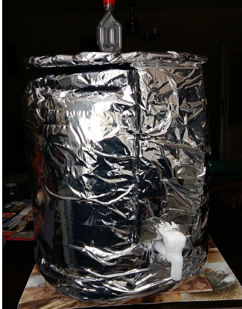 Ферментатора, изолиран с 10мм дунапрен отдолу и 2 мм дунапрен отстрани и целия обплепен с алуминиево тиско: