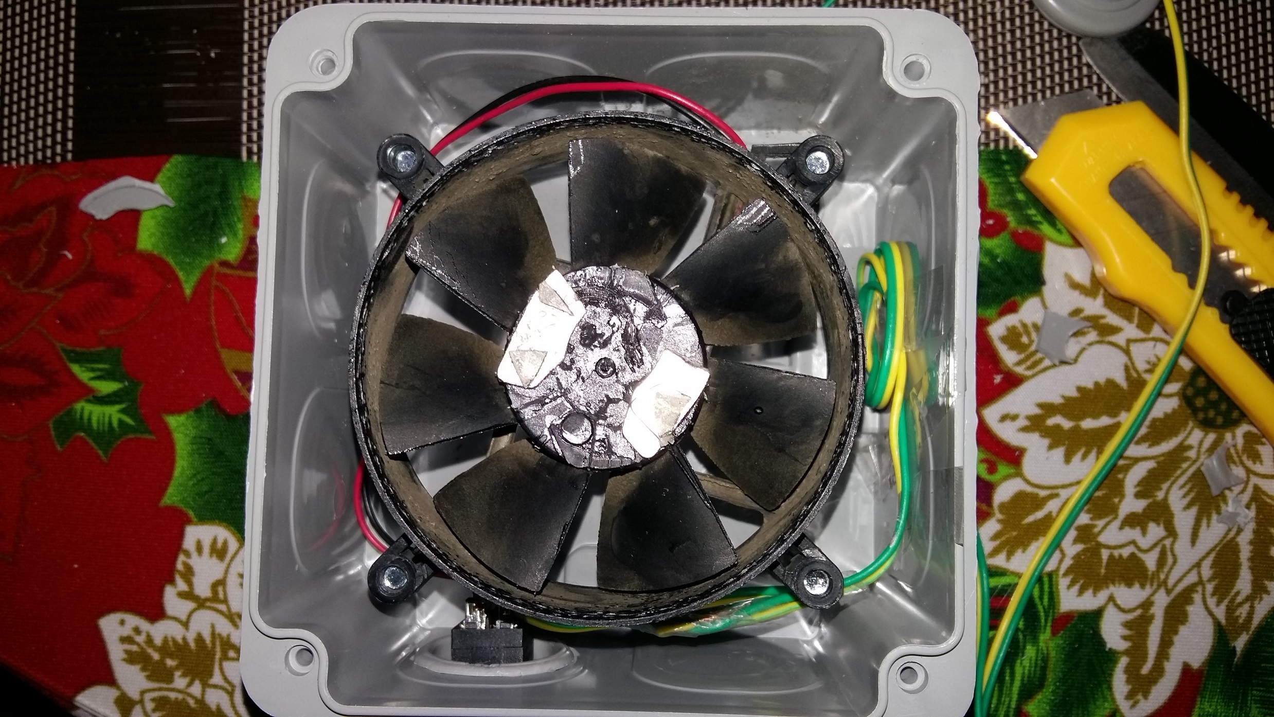 Подарени самоделен регулатор и реновиран вентилатор, купени 12 волта захранване, кутия и ключ, отрязах кабела на една нощна лампа.