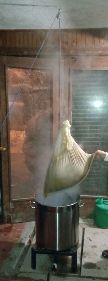 След като излезе йодната проба, повдигнах торбата изцедих и започнах да подгрявам за варене, а торбата оставих да се доизцеди и след около 30 минути, когато започна да ври добавих и това количество бирена мъст(4-5 литра).